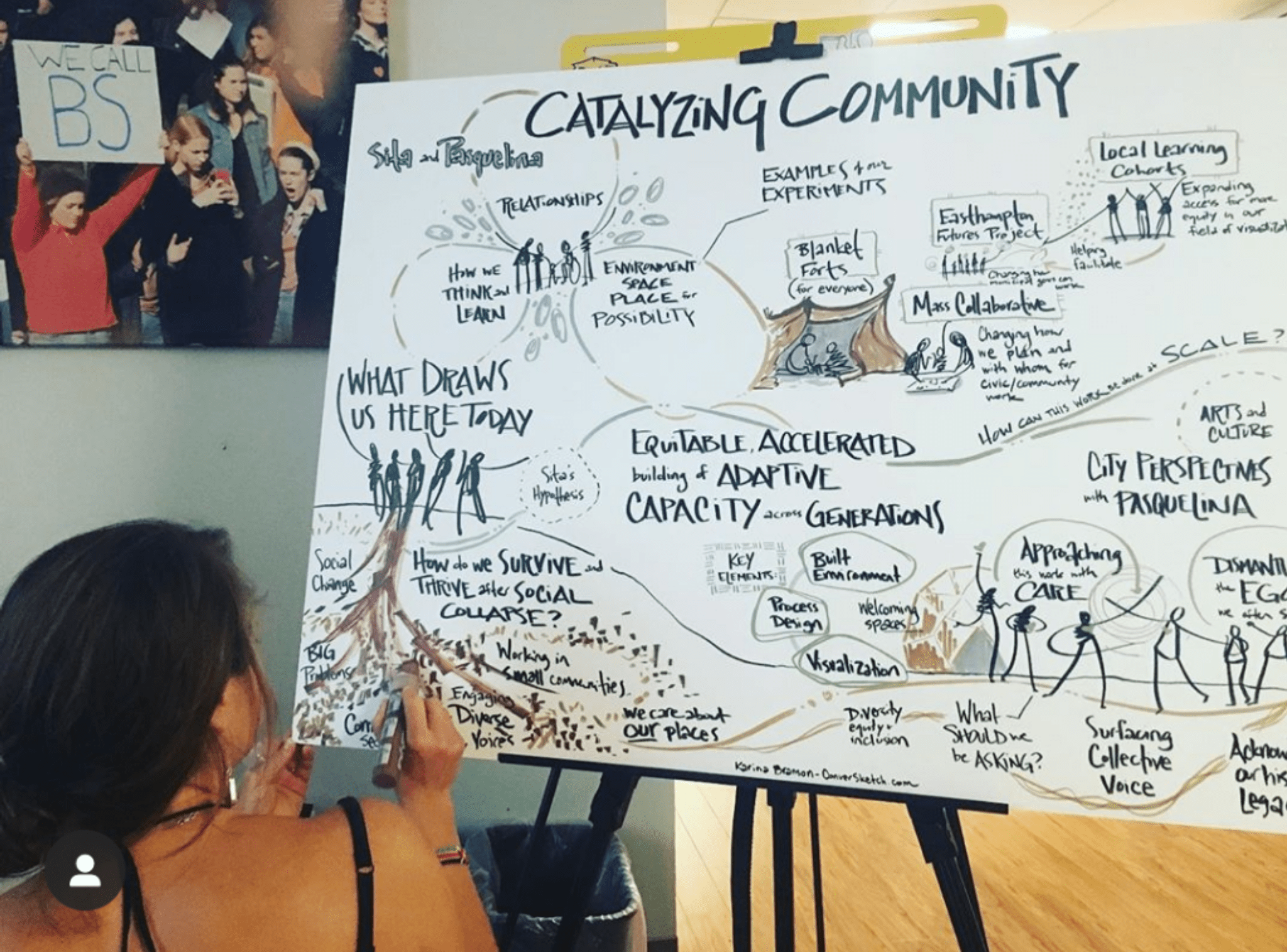 I also choose to show up as a Thought Partner for the facilitators and clients I work with by asking key questions like “What does success look like?” and “Why are you interested in having a graphic recorder at your event?” so I can listen and capture content that will best serve the needs of the group. And I provide a custom list of suggestions tailored to each client to help them continue to leverage the charts after the meeting to provide longer-term value beyond the event itself.