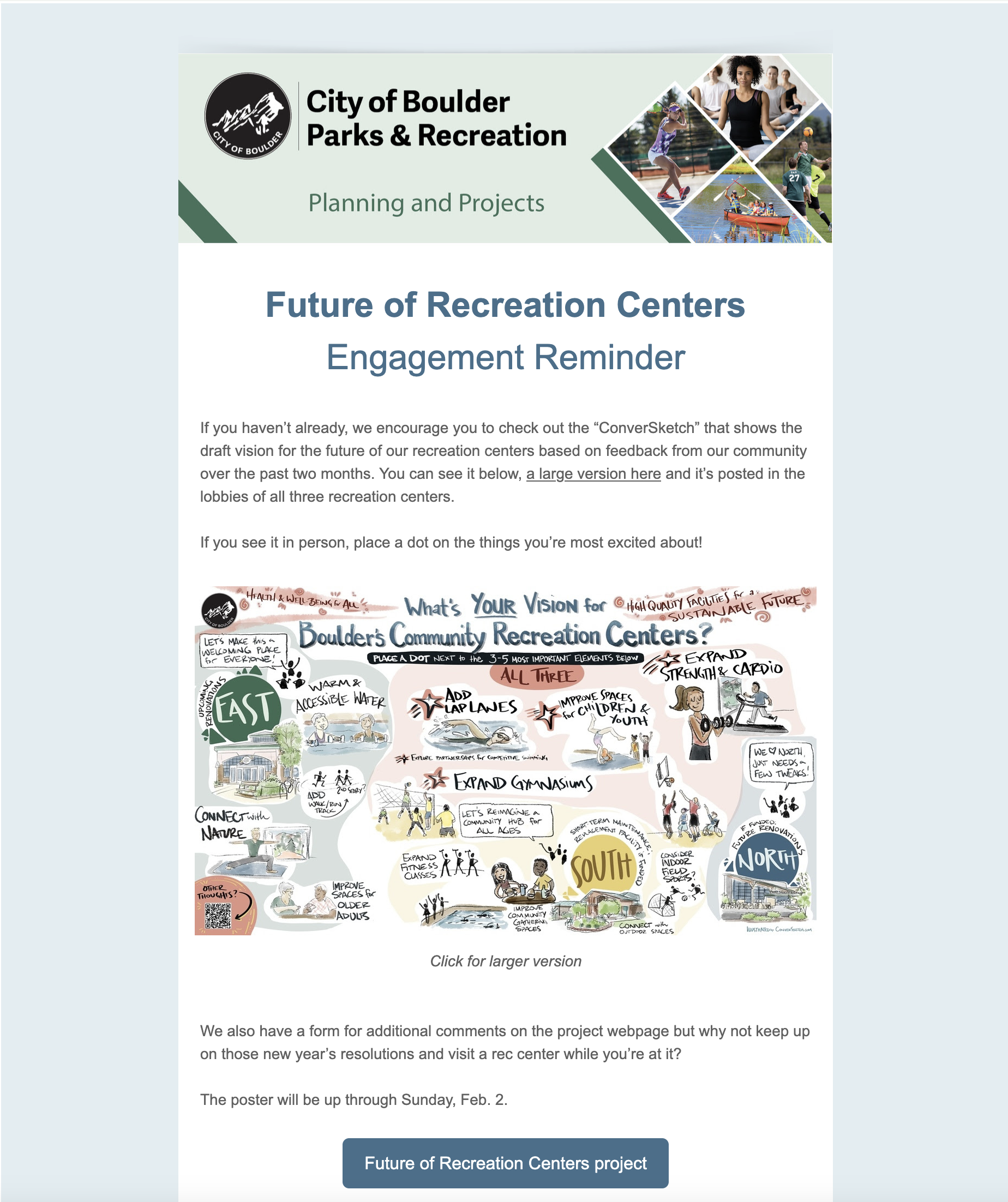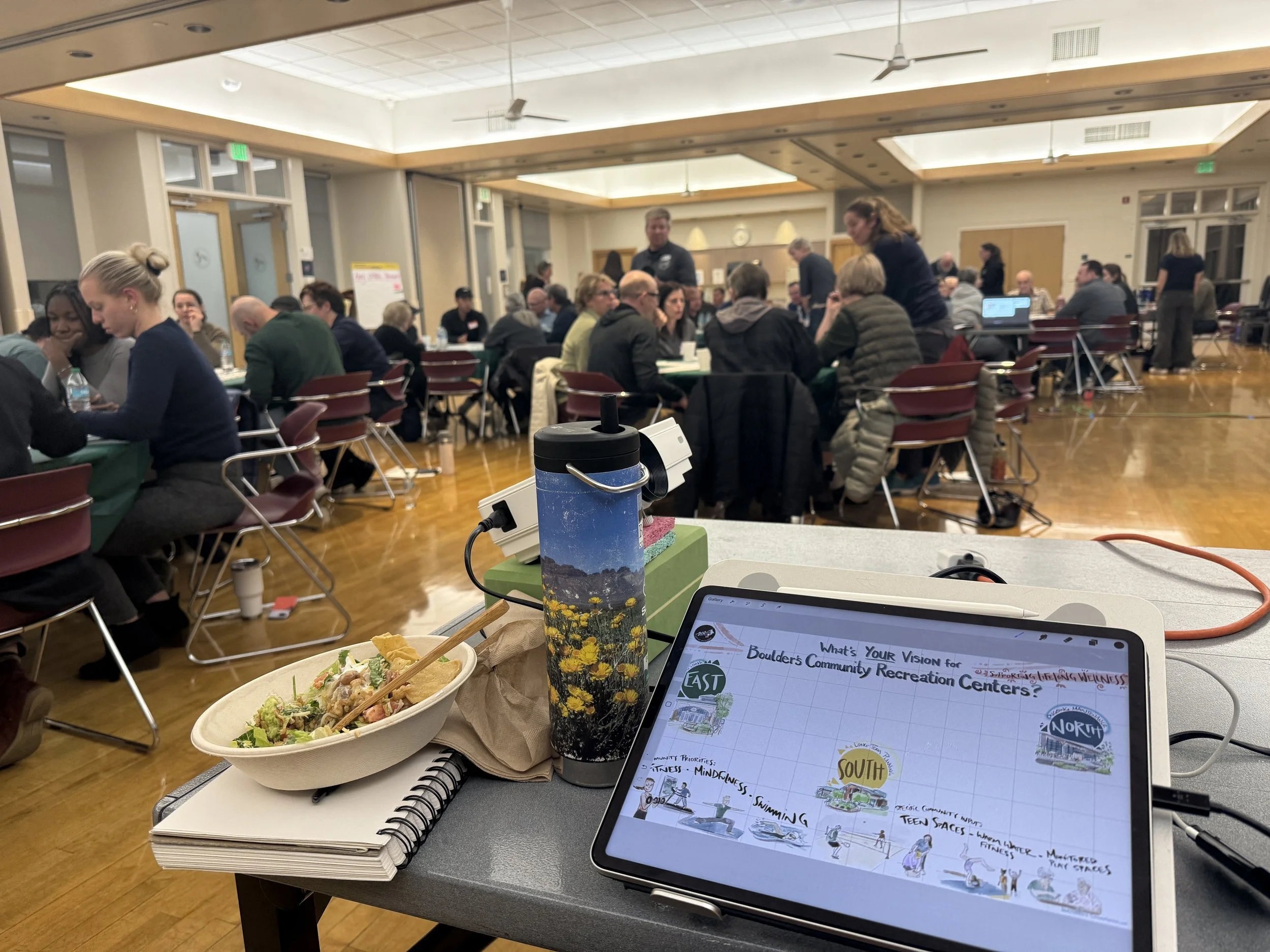 When you all bring ideas to me that are creative, I always want to share them back so others can use them. This story from Boulder's Recreation Centers demonstrates how integrating graphic recording throughout the entire process - before, during, and after - created deeper and more varied community involvement.