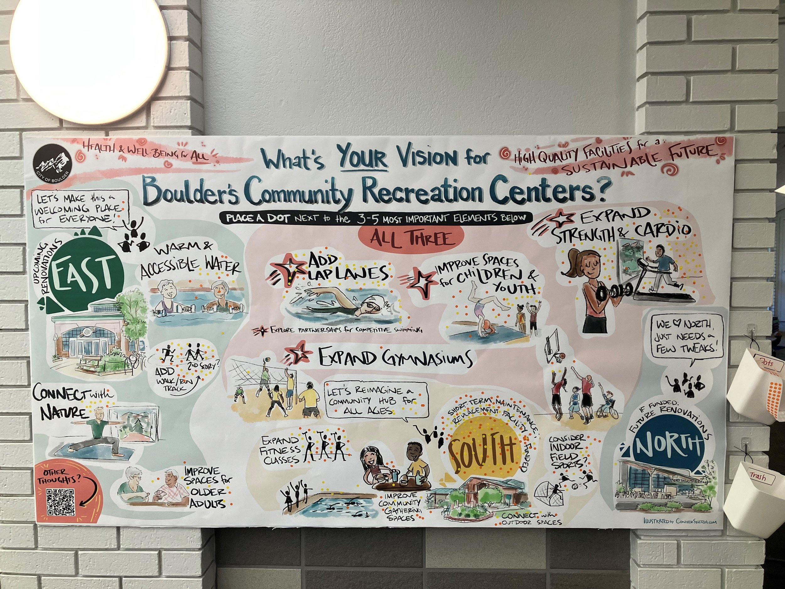 The team maximized the visual assets' potential by displaying large prints in each Boulder recreation center with interactive sticker voting for ongoing community input. This thoughtful approach extended the conversation beyond the initial session, allowing broader community participation through both the physical displays and a survey sent by email.