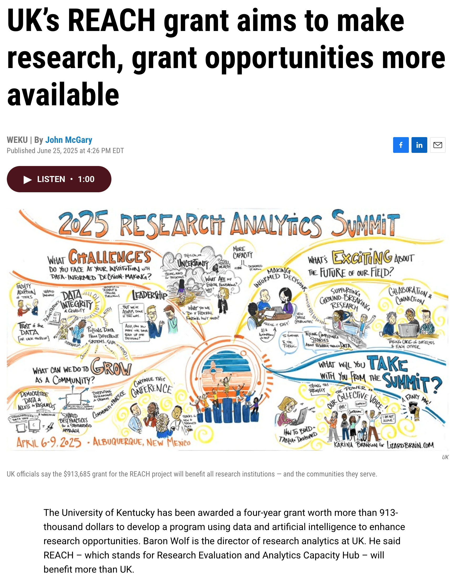 Take this story celebrating a grant win from my recent client, the University of Kentucky. The REACH (Research Evaluation and Analytics Capacity Hub) program will use AI and data to help smaller colleges and universities access more research funding.