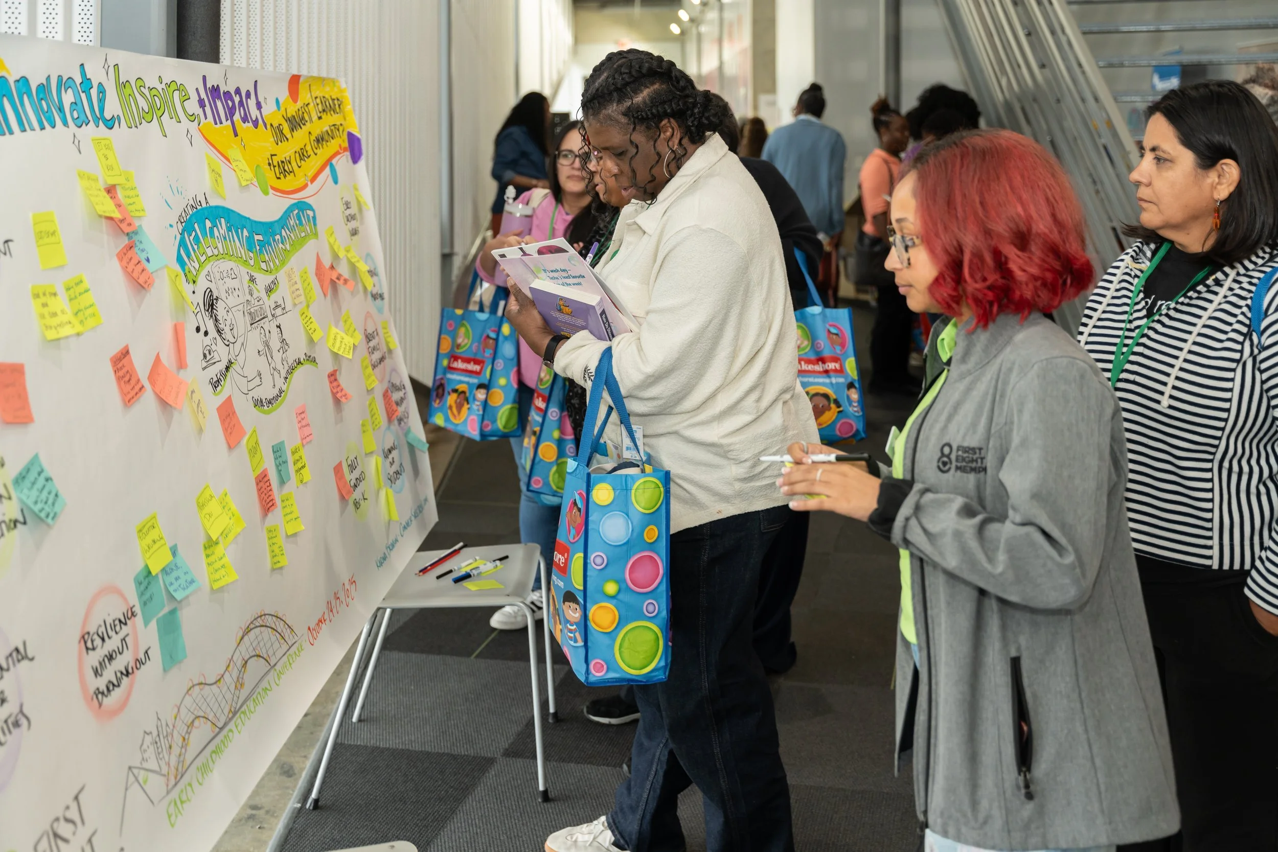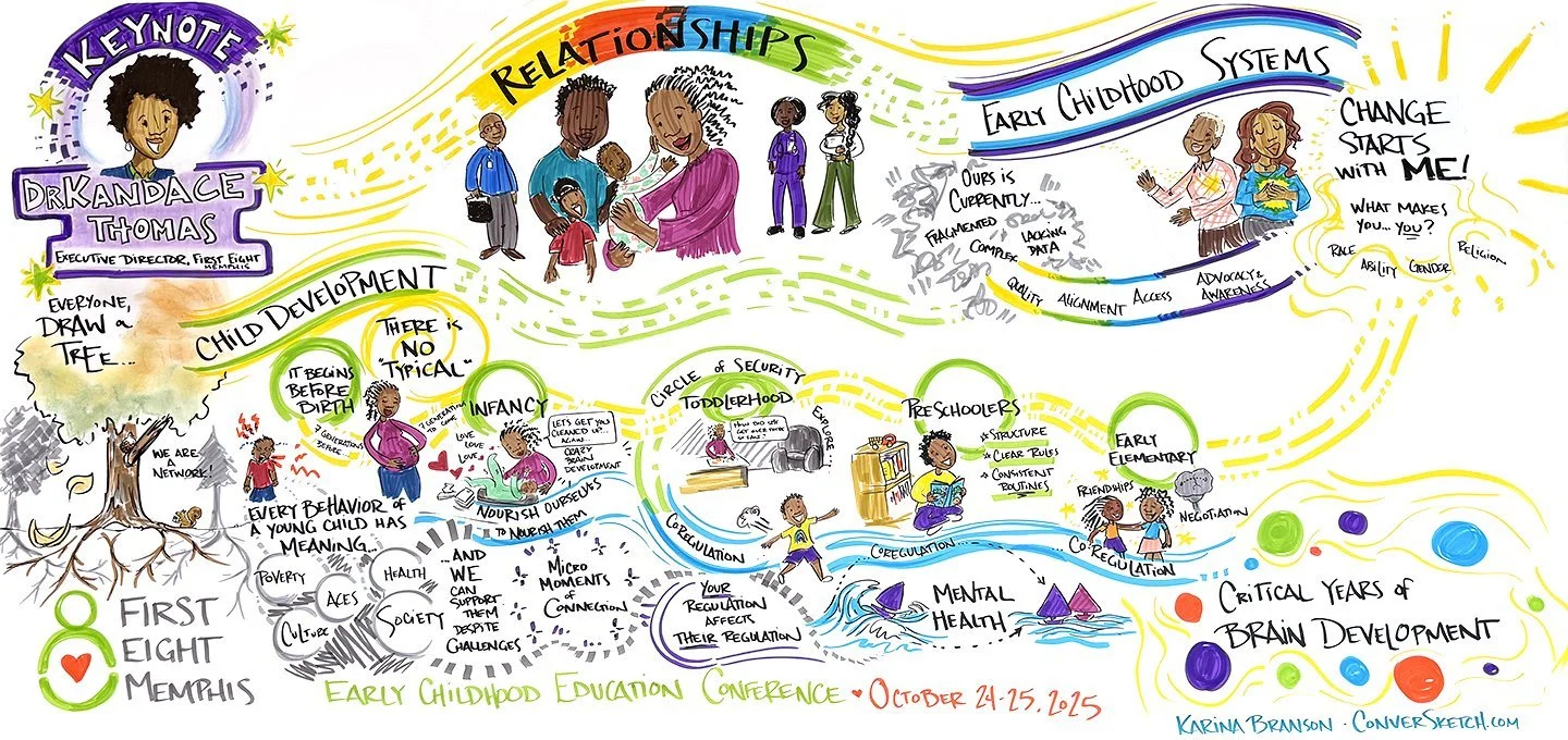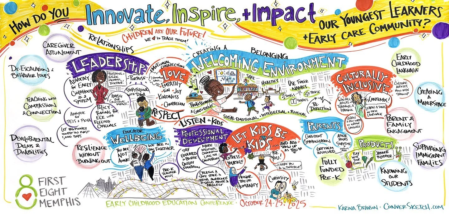 Memphis, TN: With First 8 Memphis, a convener and support organization for early childhood educators and caregivers. They treated participants right – starting with a female DJ to hype the group and a viral comedian as an emcee…and of course a graphic recorder to capture ideas and keynotes. These ladies are contributing ideas to a Knowledge Wall which I took and synthesized into an illustration by the end of the day (see second image)!