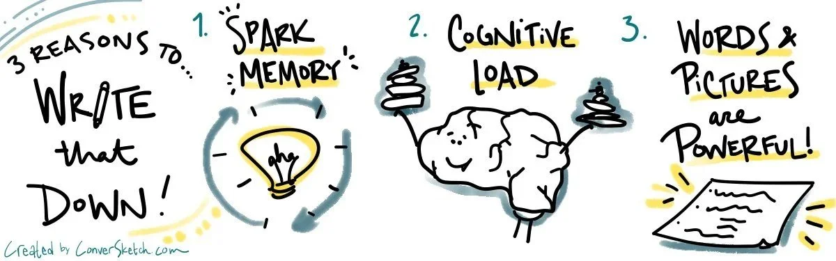 Take a (cognitive) load off. Our brains can only keep track of a finite amount of information at once, so writing or drawing your ideas out allows you to let go of some of the load while continuing what you’re doing. Getting it on paper allows you to look for connections, which also reduces cognitive load.