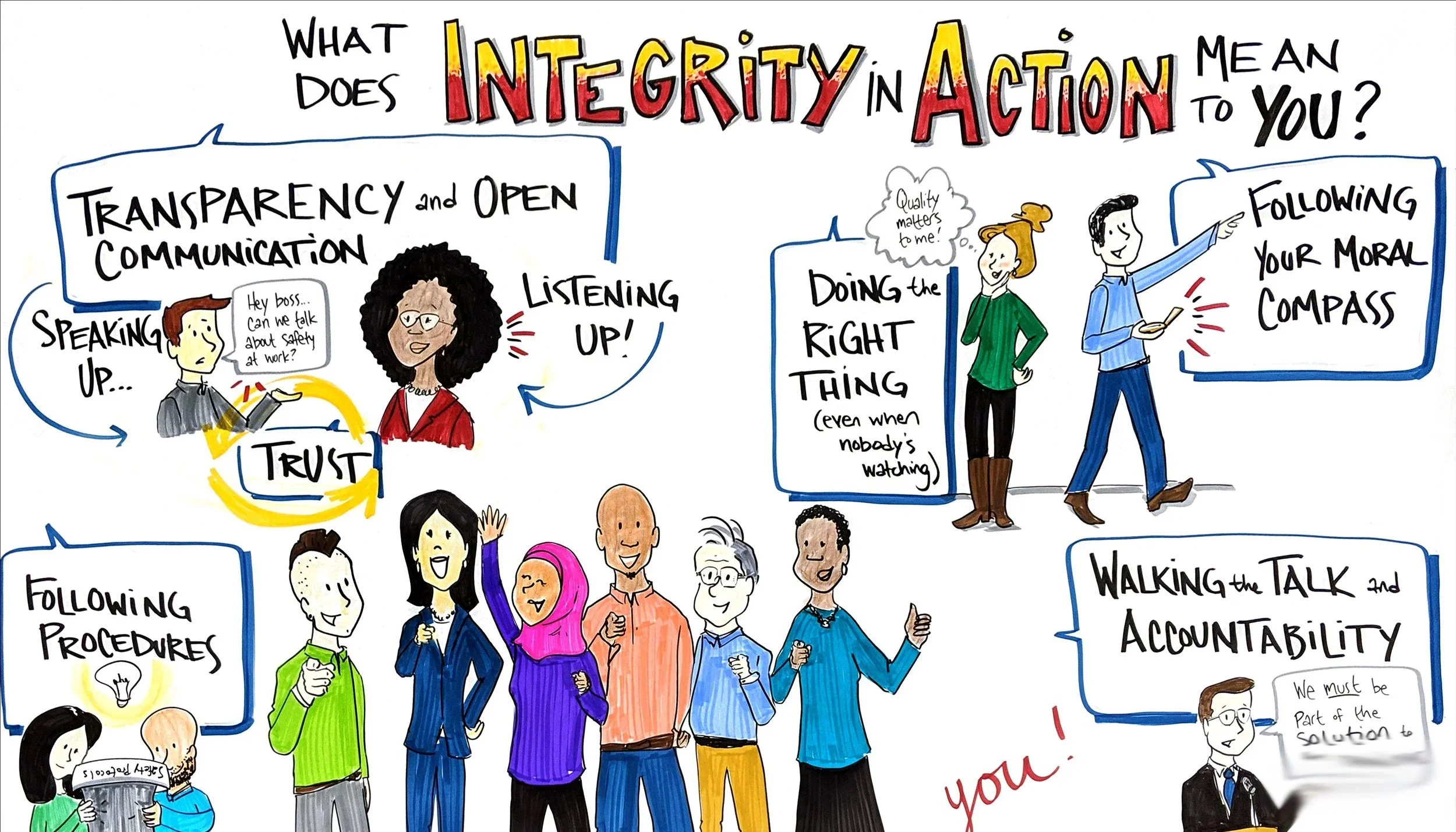 Earlier this week I was graphic recording for a company that’s had to do some soul searching this year, and as a result, is focusing on infusing integrity into the day-to-day culture. During a brainstorming session on culture and values, someone said “…unscripted feels more authentic.”