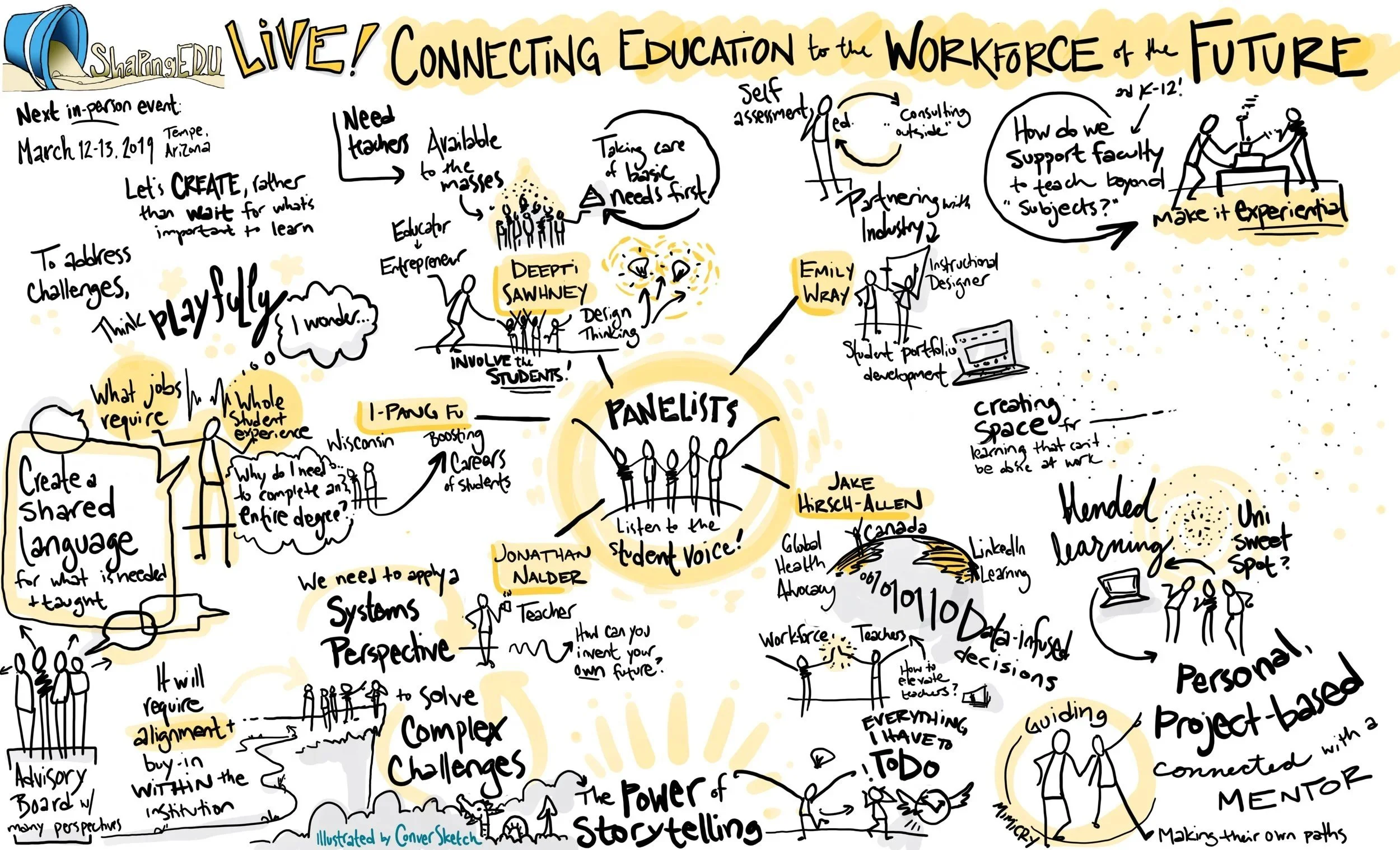 Having someone visually scribing the content, listening for connections, or even for what’s not being said can catapult participants from looking at their phone screens under the table, to wondering how their ideas can be incorporated into the mural being created. Seeing visual summaries of conversations and discussions moves groups from “My idea” to “Our vision” and “Actions I can take”. It can give them tangible stepping stones to take what they learned and move forward, or help unravel a previously complex and mystifying topic.