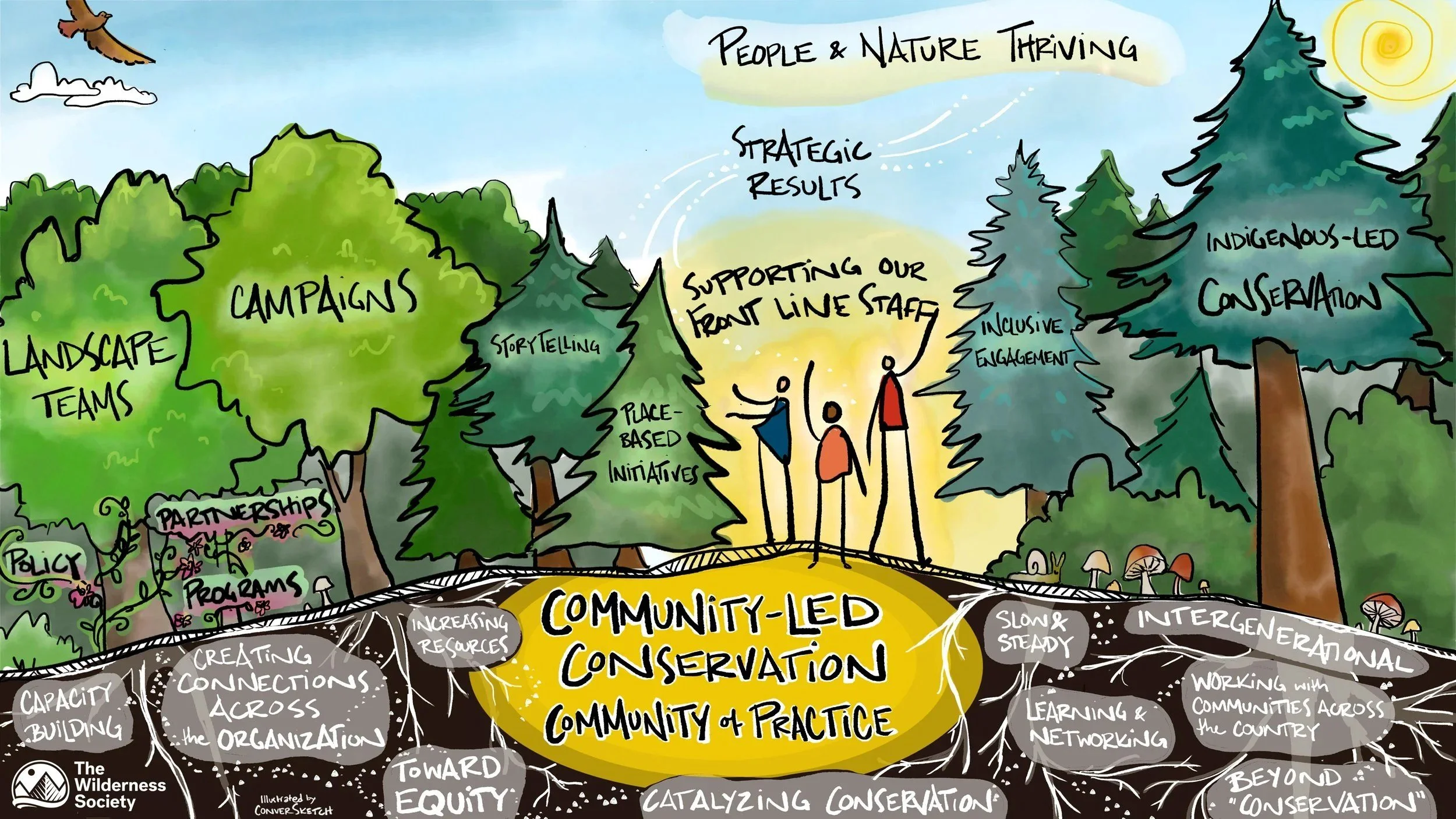 The Wilderness Society: Last fall I had the joy of working with the TWS Community-Led Conservation team to create a vision and roadmap toward truly supporting communities and wilderness. This spring we got together to finish a summary illustration of their vision and values and how they fit into the larger TWS organization.
