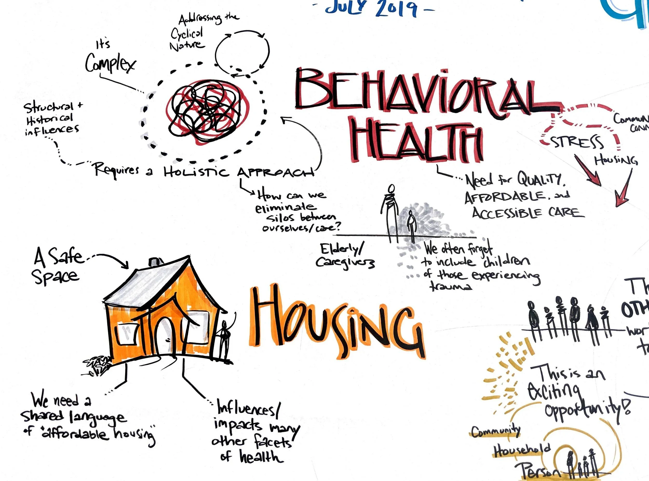 - Draw it out with the intent of surfacing shared ground. Graphic facilitation or recording is a tool to leverage to literally show the group where they’re in agreement. Partnering with a graphic facilitator who can work with you to listen and capture through a particular “lens” to help surface shared values or tensions helps the group keep track of complex, moving parts to build a shared picture of what’s important.