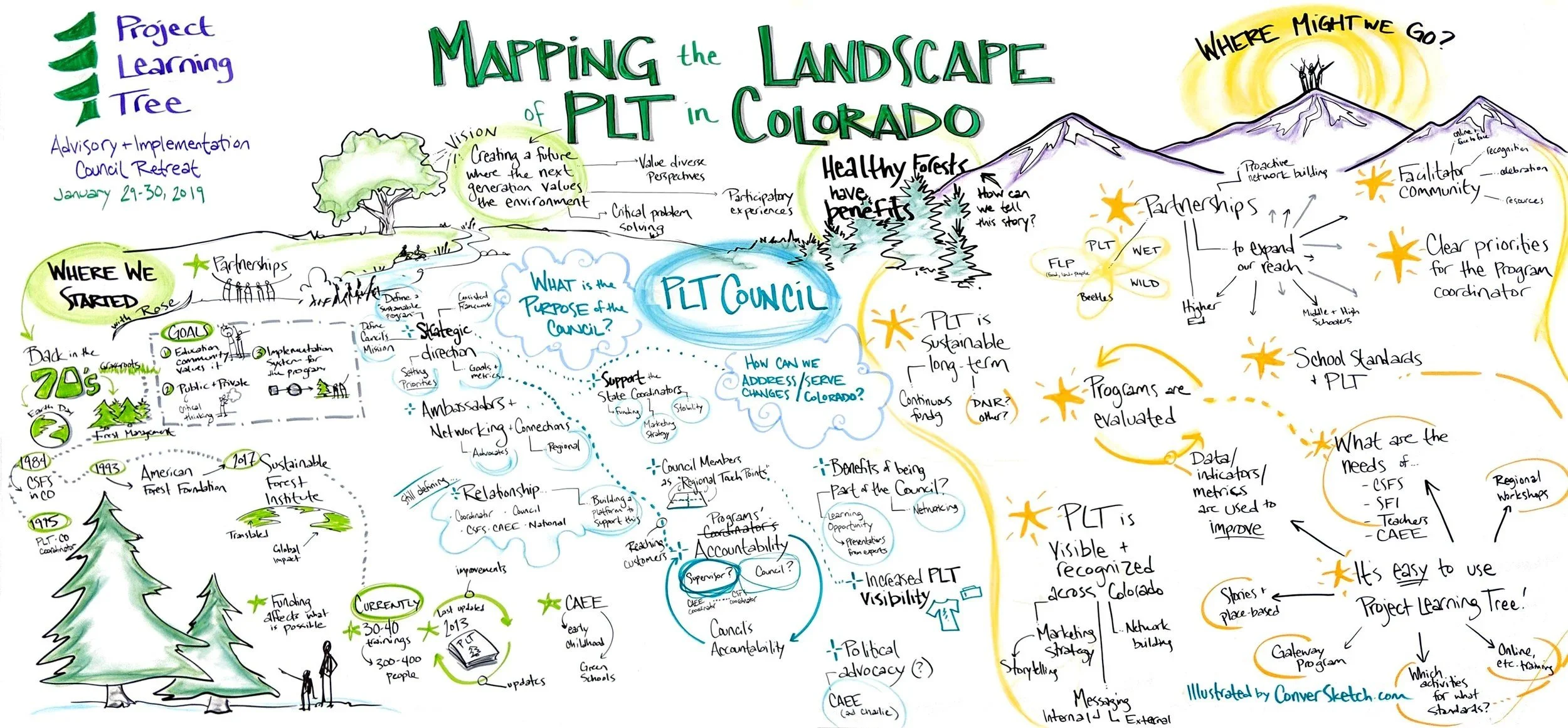 Graphic Facilitation for the newly formed Colorado Project Learning Tree Council. Check out that huge garage door window! Too bad it was below freezing over the two day retreat.