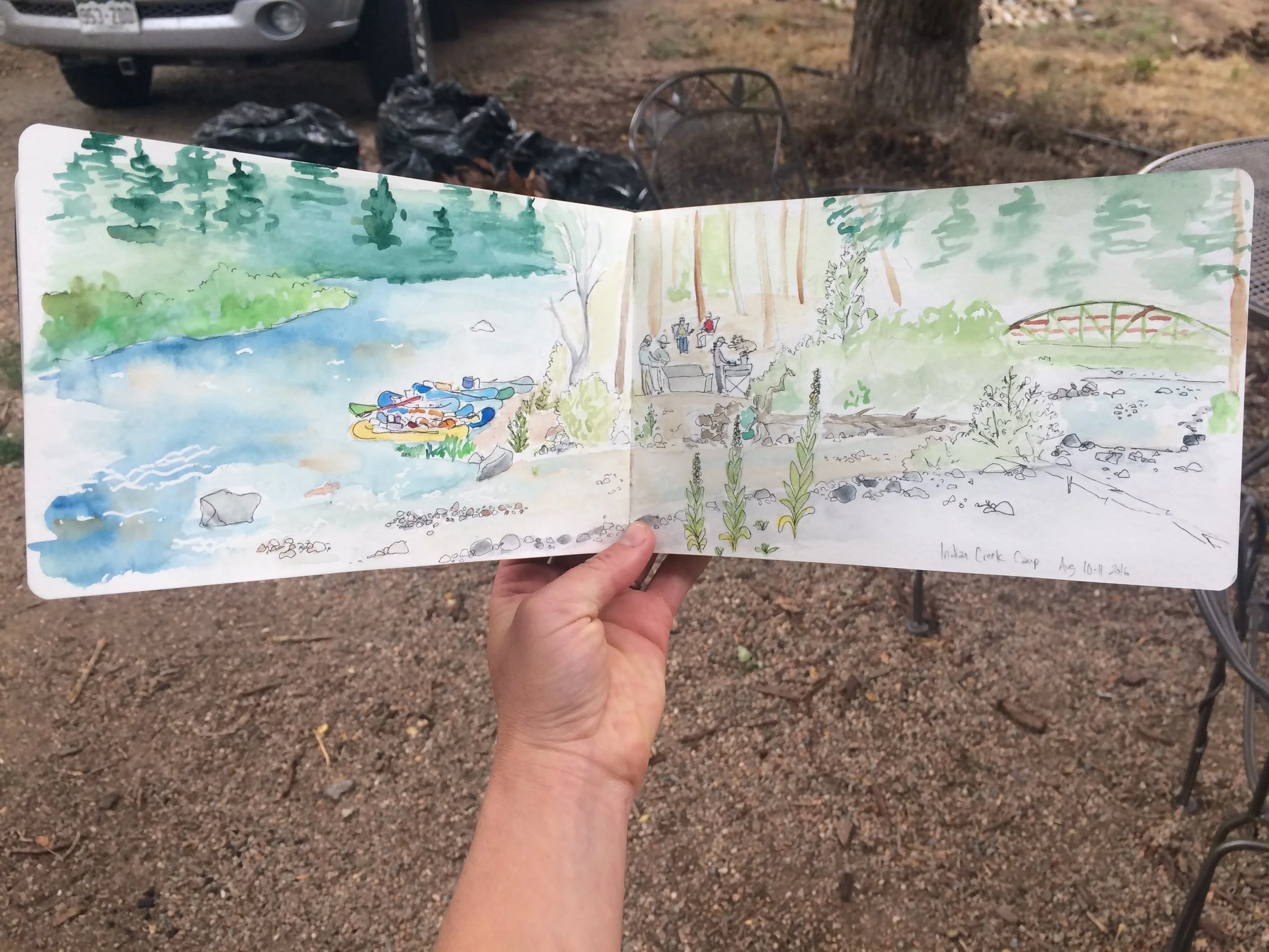 I always bring my paints on river trips and this time I was more intentional about making time to draw. Trust me, between rowing, unpacking the boat and happy hour, it takes discipline to get the paints out! Here are a couple of my favorite plein air sketches for you to get a sneak peek this week before I go posting them on Instagram. If you haven’t already, follow me there @ConverSketch for more behind-the-scenes graphic recording and watercolor shenanigans.
